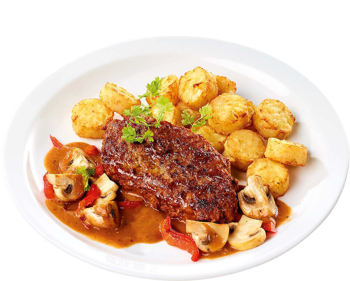 Rösti-Taler (Kartoffeln, Rapsöl, Stärke, jodiertes Speisesalz (Speisesalz, Kaliumjodat), Traubenzucker, Verdickungsmittel Methylcellulose, Zwiebelextrakt, Gewürze), Kalbshacksteak (19%) (Kalbfleisch (50%), Rindfleisch (30%), Semmelbrösel (WEIZENMEHL, Wasser, Speisesalz, Zucker, Hefe), HÜHNEREI, Zwiebeln, jodiertes Speisesalz (Speisesalz, Kaliumjodat), Gewürze), Wasser, Champignons (10%), SAHNE (6%), Gemüsepaprika (2%), Zwiebeln, Rapsöl, Gewürzgurken (1%) (Gurken, Wasser, Branntweinessig, Speisesalz, Zucker), Rotwein (1%), Gemüsefond (Wasser, Gewürzextrakte, Tomatenmark, Gewürze, Trockenglucosesirup, Karottenextrakt, Tomatenpulver, Speisesalz, Branntweinessig), modifizierte Stärke, Rinderfond (Rindfleisch, Rinderfett, Rinderbratensaft, Meersalz), Senf (Wasser, SENFSAAT, Branntweinessig, Weinessig, Speisesalz, Zucker, Sherryessig, Gewürze), Tomatenmark, Zucker, jodiertes Speisesalz (Speisesalz, Kaliumjodat), Kräuter, Gewürze (enthält SELLERIE), Pastinakenpulver, Dextrose.