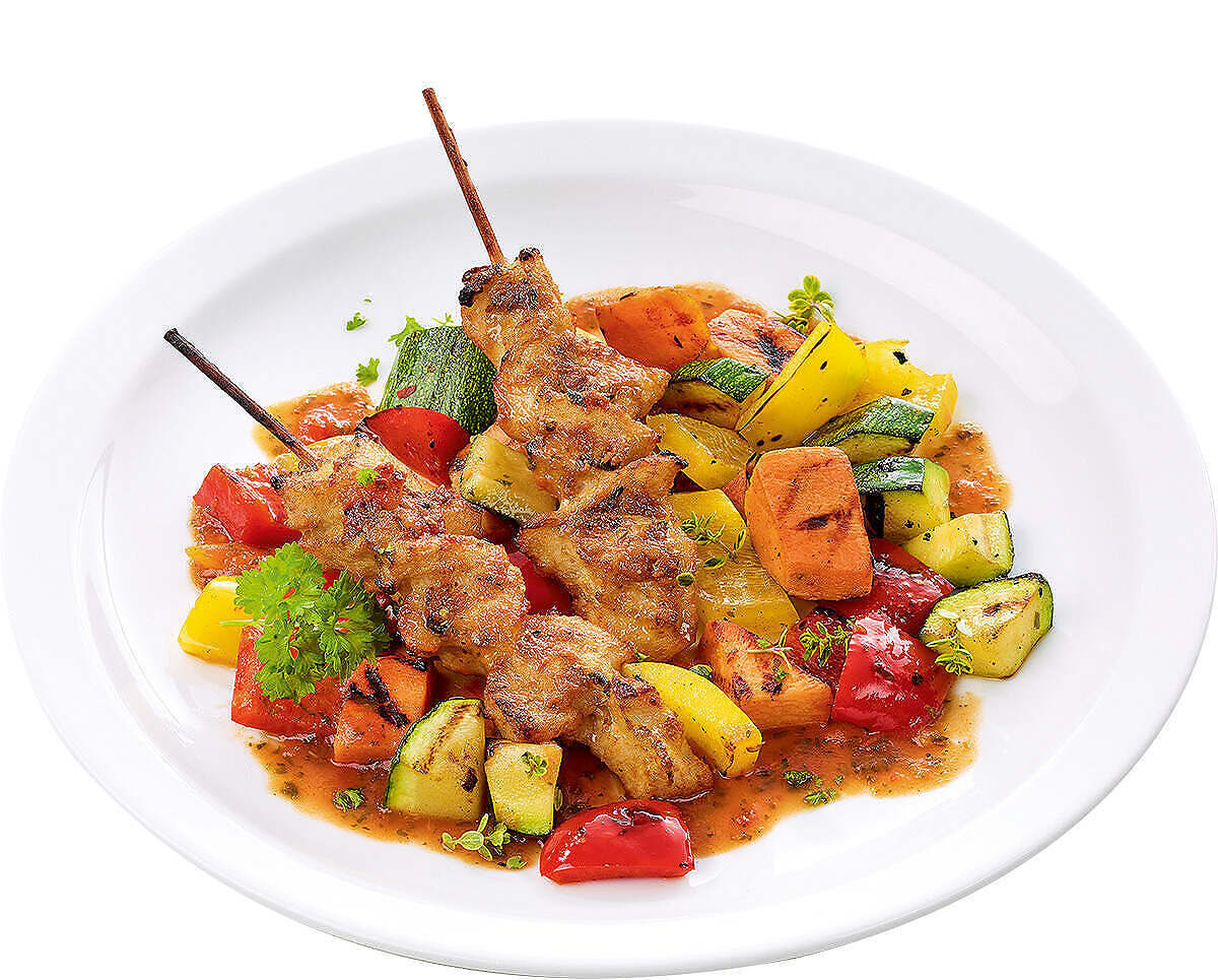 zwei Hähnchenspiesse mit Kräuter-Pfeffer-Rub, auf Grillgemüse mit Süsskartoffeln und Tomatensugo, scharf abgeschmeckt.