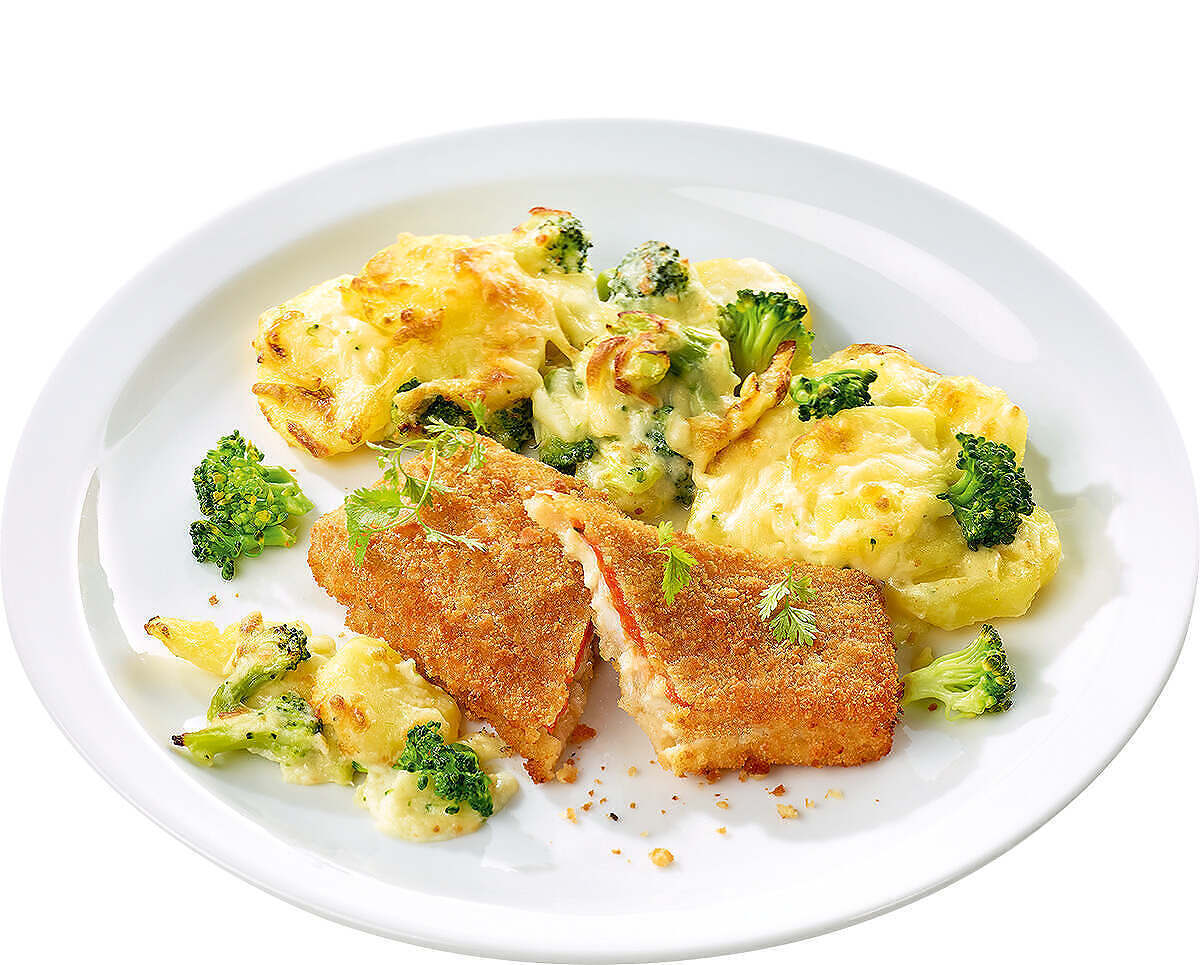 paniertes Alaska-Seelachsfilet mit feiner Tomatenfüllung, Kartoffel-Broccoligratin.