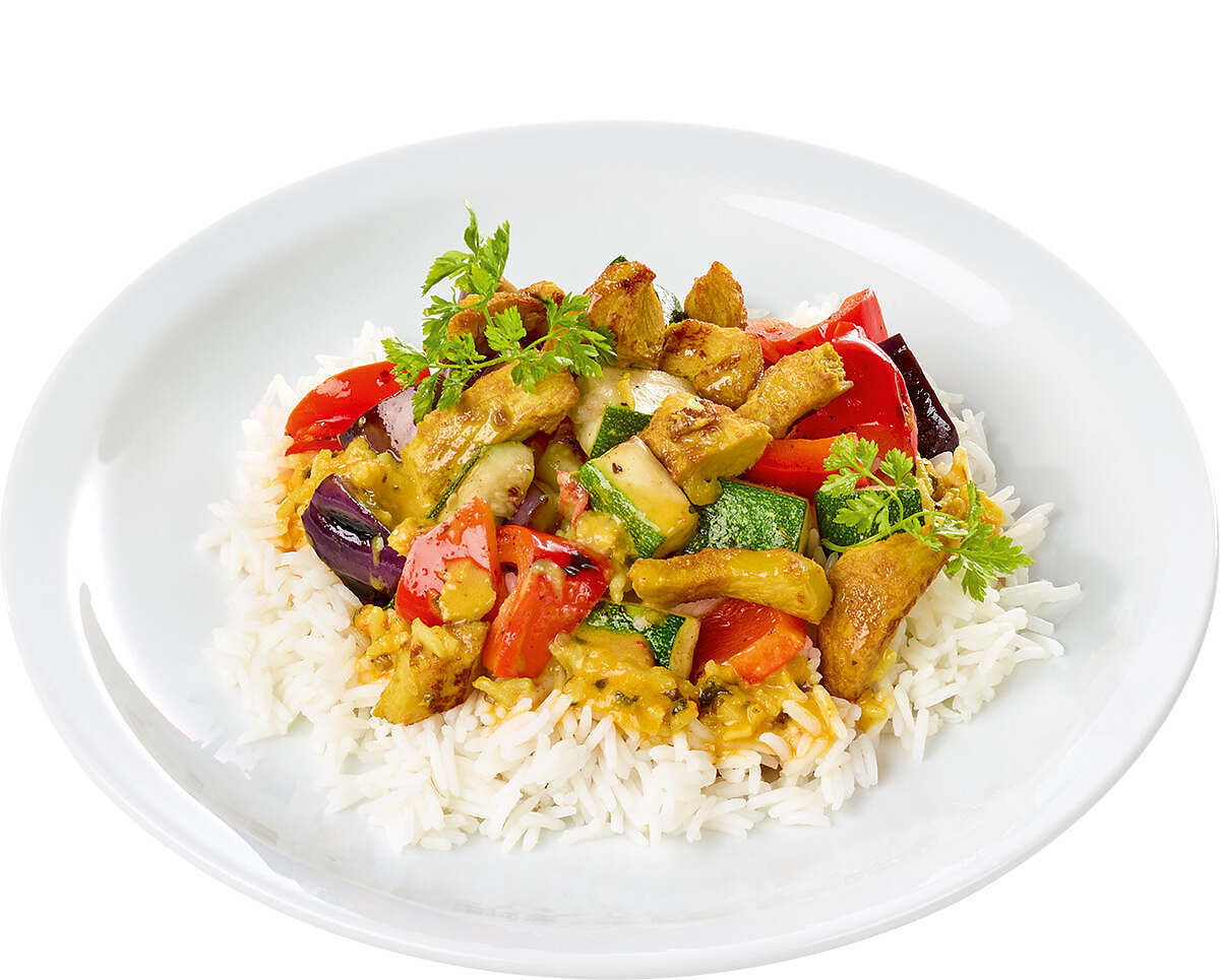 Aus unserer eigenen Gewürzküche: mildes, gelbes Thai-Curry mit Ingwer, Zitronengras, Thai-Basilikum und Kokosnussmilch, mit zarten Hähnchenbruststreifen und edlem Grillgemüse auf lockerem Basmatireis.