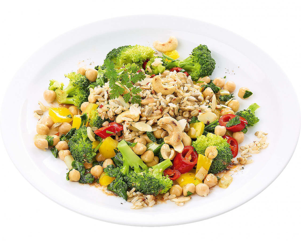 mit Kichererbsen und Vollkorn-Nuss-Reis mit Sonnenblumenkernen, Cashewkernen und Mandeln.