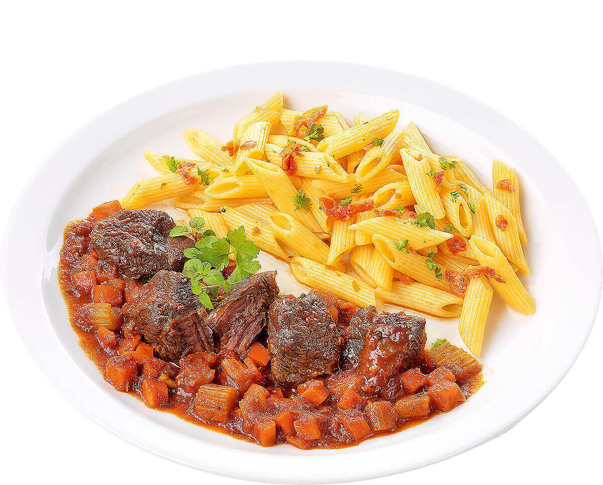 traditionell in Rotwein und Wurzelgemüse geschmort, Tomaten-Penne.