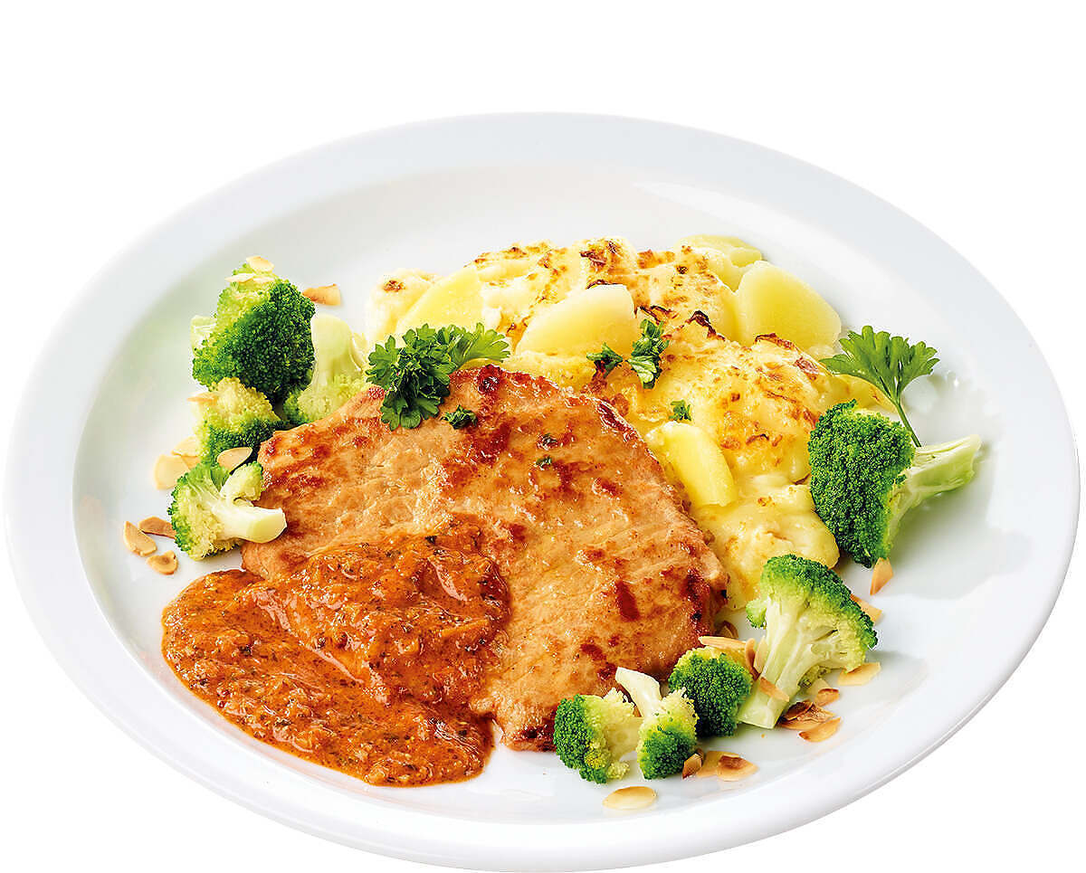 Schweinesteak in Senf-Meerrettich-Sauce, dazu Mandel-Broccoli und Kartoffelgratin.