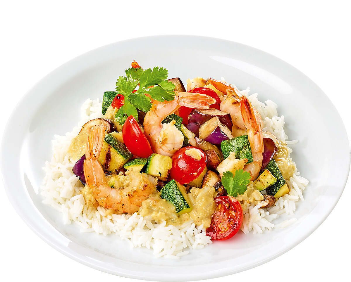 Basmatireis gegart (32%) (Wasser, Basmatireis), Gemüse in veränderlichen Gewichtsanteilen (Auberginen gegrillt, Zucchini gegrillt, Cherrytomaten, Champignons), Garnelen glasiert (16%) (GARNELEN (80%), Wasser, Speisesalz), Kokosnussmilch (Kokosnussextrakt, Wasser), Zwiebeln, Rapsöl, SARDELLENEXTRAKT, Erbsen püriert, jodiertes Speisesalz (Speisesalz, Kaliumjodat), Äpfel, Kokosnussmilchpulver (Kokosnussmilch, Maltodextrin, NATRIUMCASEINAT), grüne Currypaste (grüner Chili, Zitronengras, Gewürze, Schalotten, Speisesalz), Zucker, Knoblauch, Gewürze, Orangensaftkonzentrat, Zitronensaftkonzentrat, Limettenblätter.